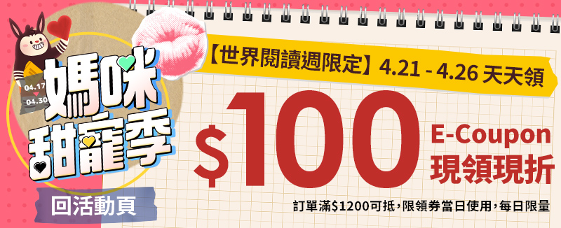 於活動期間內登入博客來會員,每一會員帳號可領一張100元E-Coupon(訂單滿$1200,且購物車內有一項商品高於$100即可抵用),限量領完為止。參加者於參加本活動時,即視為同意接受本活動規範,博客來有權決定取消、終止、修改或暫停本活動。