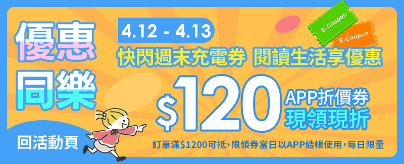 於活動期間內登入博客來會員,每一會員帳號可領一張120元E-Coupon(限APP使用,訂單滿$1200且購物車內有一項商品價格高於$120即可抵用),限量領完為止。參加者於參加本活動時,即視為同意接受本活動規範,博客來有權決定取消、終止、修改或暫停本活動。