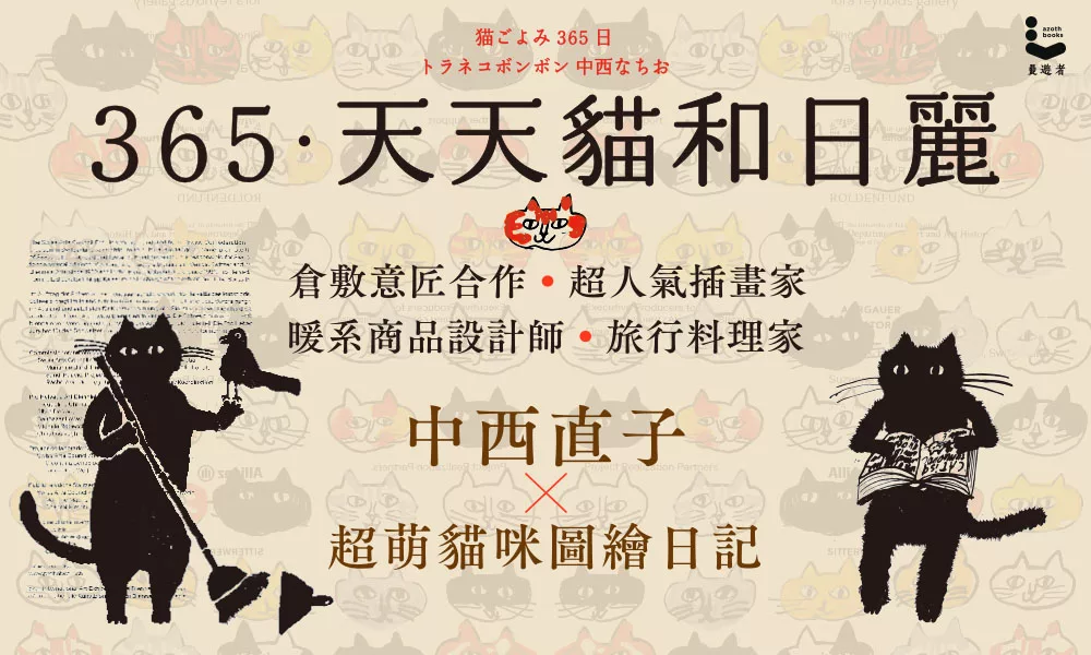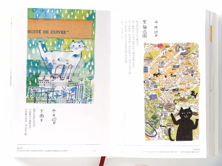 《365.天天貓和日麗》是中西直子運用所收集的各類紙張,包括:二手書頁、樂譜、手工紙、舊報紙等等,混搭水彩、墨水、色鉛筆、壓克力顏料、蠟筆等多樣畫具,拼貼及描繪出366張創意十足的貓畫作。