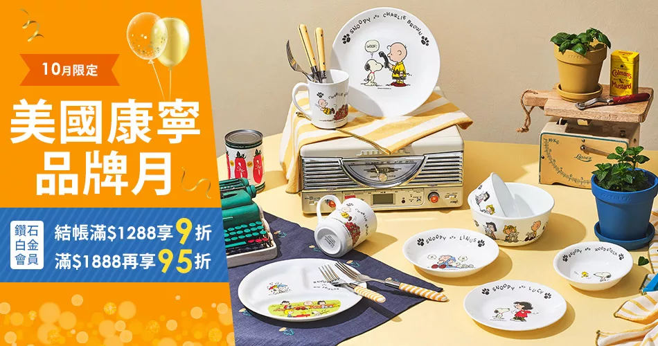 3. 活動辦法:鑽石、白金會員於活動期間內購買【美國康寧 CORELLE】之參展品牌商品,單筆訂單實際消費金額滿$1288元結帳享9折,滿$1888元結帳再享95折。