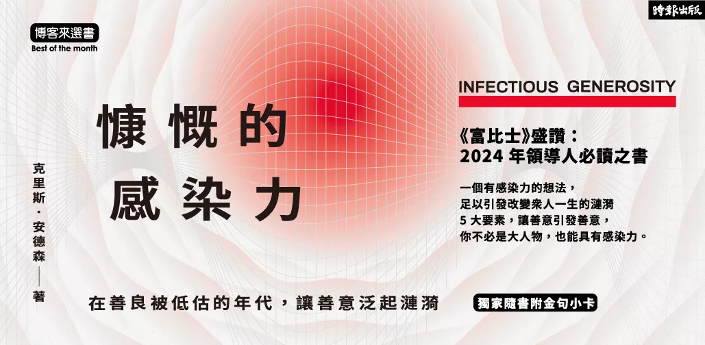 他認為,是時候了,於是提筆寫下這本用全新視角看待慷慨(不限於金錢)的書,透過鼓舞人心的案例,他要分享如何讓慷慨變得具有感染力,而且是一種我們希望永遠不會痊癒的感染力。