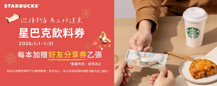 單筆購買每本星巴克飲料券贈送乙張好友分享券(贈品價值$120元),以此類推(好友分享券使用效期至2026年6月30日止)