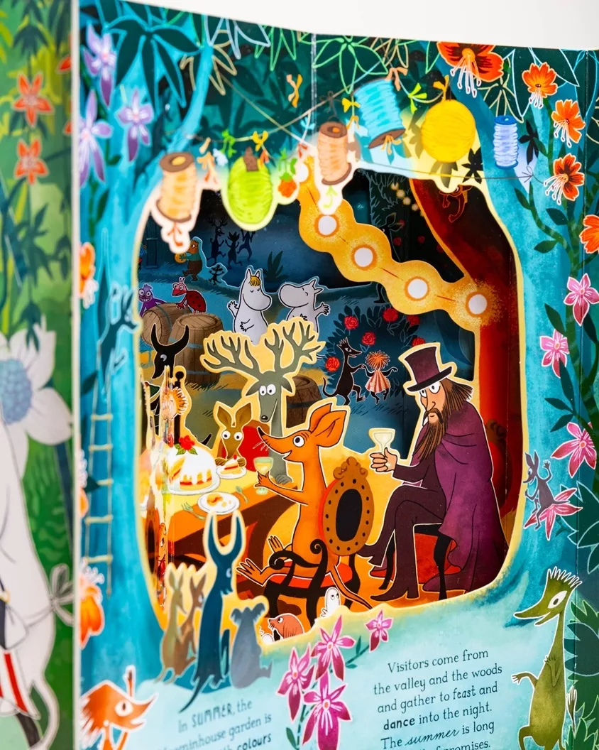 歡迎光臨姆米(Moomintroll)的家,姆米在家裡沿著風箏線尋找他的風箏,他拉著一根紅線,但這根線會連接到哪裡?跟著姆米的腳步,你會看到總是四處流浪的阿金(Snufkin)吹著他心愛的口琴,善良愛撒嬌的歌妮(Snorkmaiden)在空中盪鞦韆,小美(Little My)從樓梯上滑下來⋯⋯。一路上掀開房門、打開櫥櫃、翻開門,探索嚕嚕米家的這趟旅程讓你發現許多新奇的事。