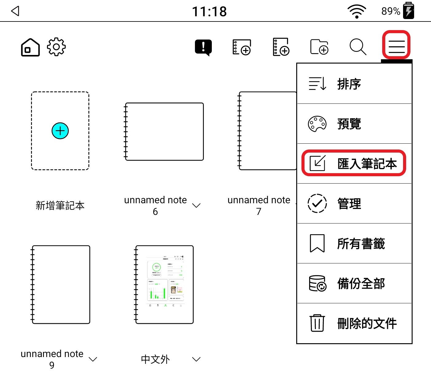 於電子筆記本工具列選擇「≡」圖示,點選「匯入筆記本」選擇欲匯入的筆記即完成