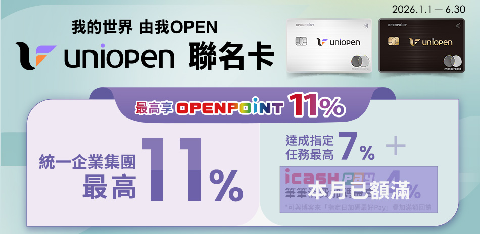 本活動限直接使用中國信託uniopen聯名卡、或使用中國信託uniopen聯名卡綁定icash Pay支付,不適用綁定其他行動錢包支付(如:、OPEN錢包、LINE Pay、台灣行動支付等)等交易。活動期間訂單以實際完成結帳流程之訂購時間為準,交易金額須單筆全額支付(不含分期付款、紅利折抵、或其他本行提供之折扣活動)方可符合回饋資格,單筆訂單恕不累計、不同訂單恕不累計贈送。OPENPOINT點數回饋計算方式為「實際交易金額×點數回饋倍率」,計算至小數點後第二位(依小數點後第三位四捨五入計)。
