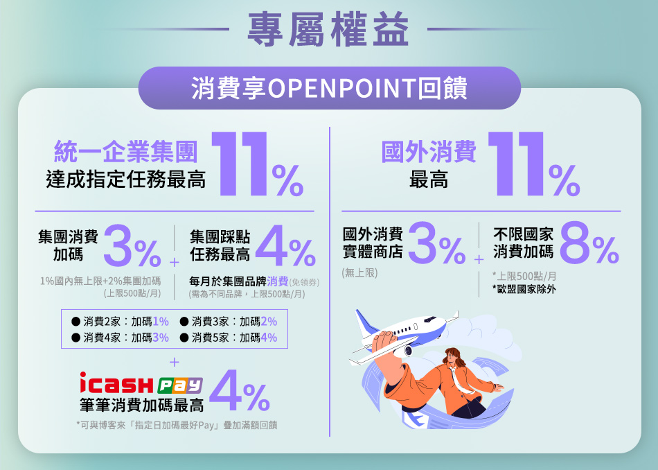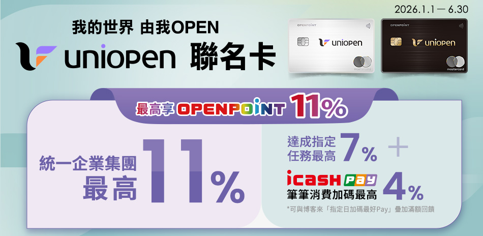 本活動限直接使用中國信託uniopen聯名卡、或使用中國信託uniopen聯名卡綁定icash Pay支付,不適用綁定其他行動錢包支付(如:、OPEN錢包、LINE Pay、台灣行動支付等)等交易。活動期間訂單以實際完成結帳流程之訂購時間為準,交易金額須單筆全額支付(不含分期付款、紅利折抵、或其他本行提供之折扣活動)方可符合回饋資格,單筆訂單恕不累計、不同訂單恕不累計贈送。OPENPOINT點數回饋計算方式為「實際交易金額×點數回饋倍率」,計算至小數點後第二位(依小數點後第三位四捨五入計)。