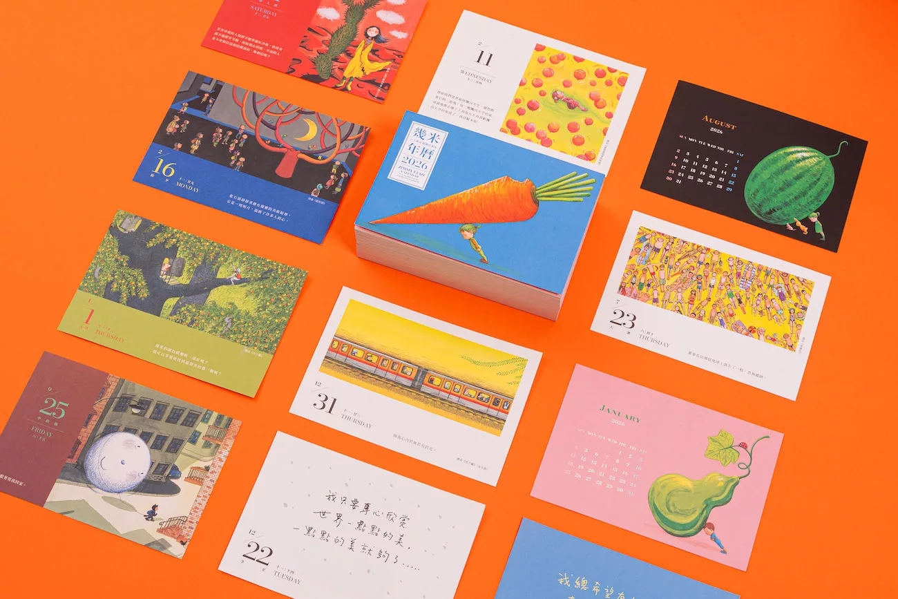 《幾米年曆2026》的主畫面選用幾米倍受歡迎的「頭碰頭」系列畫作來呈現——從包裝的收納盒、年曆主圖,再到每一個月的月分頁,以及幾米親米簽名的畫卡,都是暖心的頭碰頭系列。