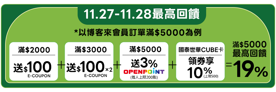 | ➤意即博客來會員購買參與本活動之商品實際消費金額達$5,000(含)以上,享有(單筆滿$2,000贈$100 E-Coupon)+ (單筆滿$3,000贈$100 E-Coupon 2張)+ (單筆滿$5,000再回饋150.87點OPENPOINT) + (國泰CUBE卡結帳領券享10%回饋500點小樹點) = 享最高回饋19%。 |