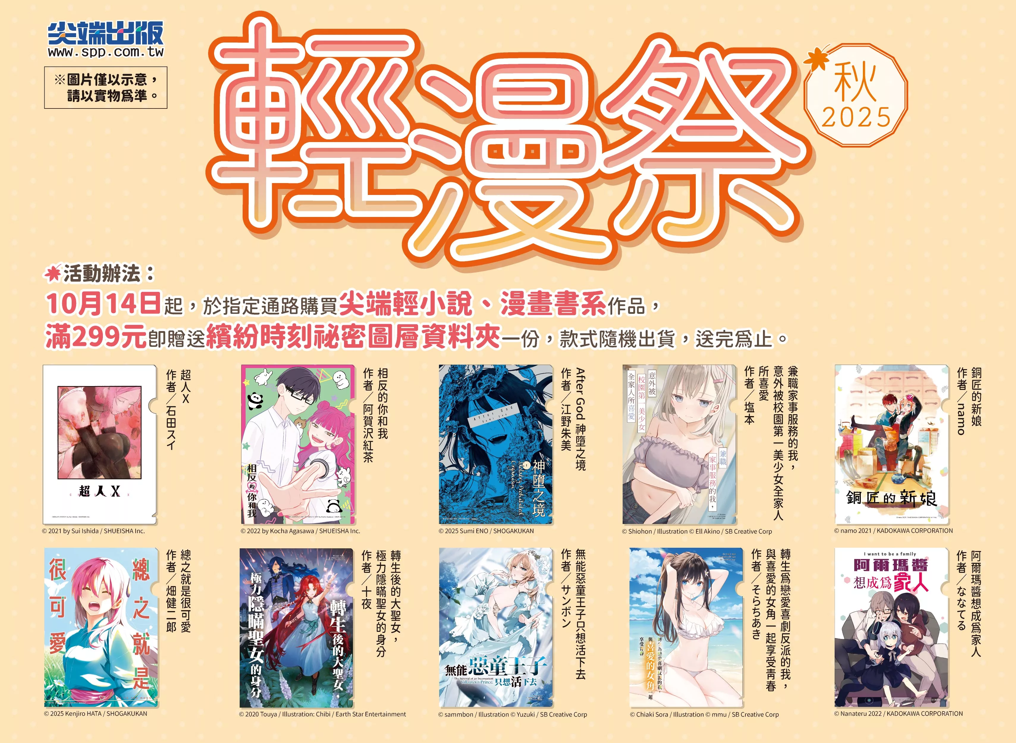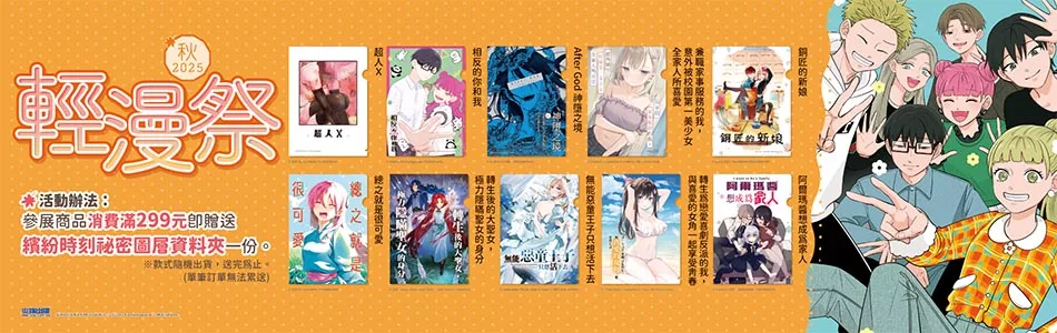 2025尖端秋季輕漫祭,參展商品消費滿$299元即贈送『繽紛時刻秘密圖層資料夾』一份,共10種款式隨機出貨,送完為止。(單筆訂單無法累送)