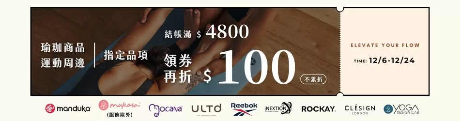 瑜珈運動週邊指定品牌結帳滿$4800領券折$100