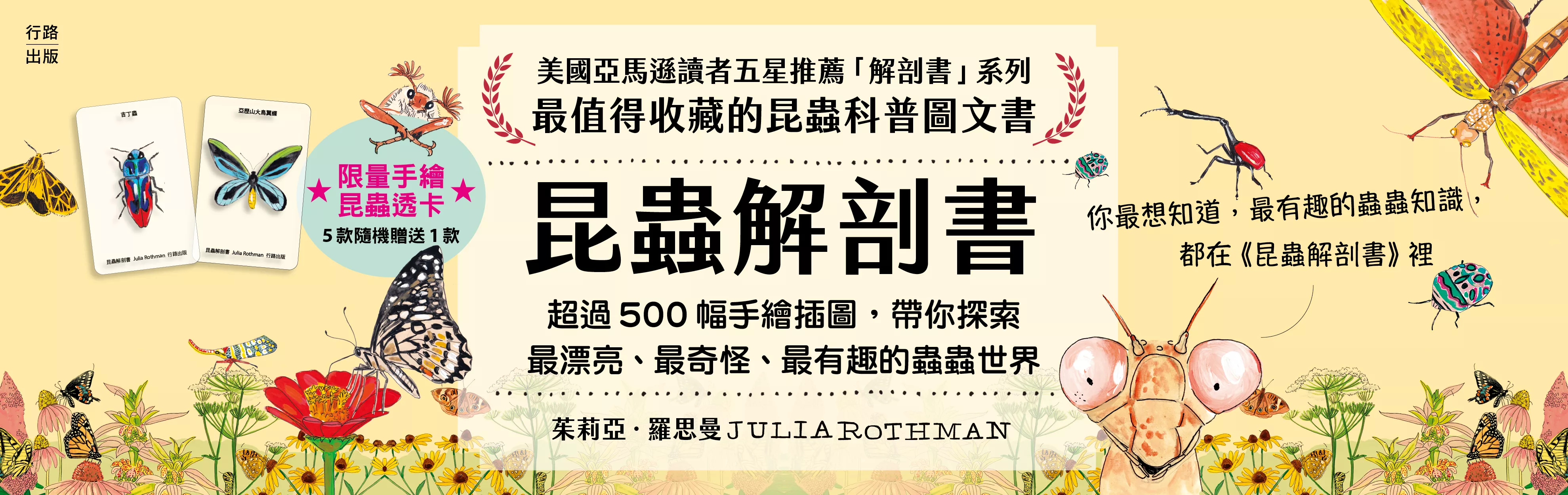 目前全世界已鑑定的昆蟲就超過了100萬種,占了所有已經發表物種的一半以上,但科學家估計,我們發現的昆蟲種類,僅僅是全部的20%左右。茱莉亞.羅思曼是美國非常受歡迎的科普圖文書作家,手繪「解剖書」(Anatomy)系列是她最暢銷的作品。她擅長拆解知識結構,以深入淺出的文字,搭配色彩豐富、充滿溫暖手感的手繪插圖,將科普知識轉化為繽紛討喜的圖文書,廣受各年齡層讀者喜愛。