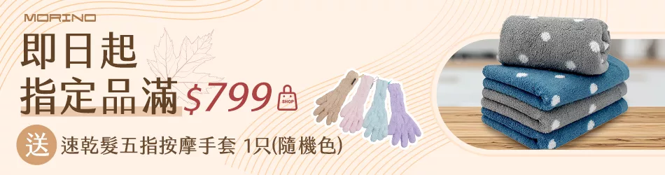 即贈「【MORINO】速乾髮五指按摩手套1入」🎁(隨機不挑款,數量有限,送完為止)。