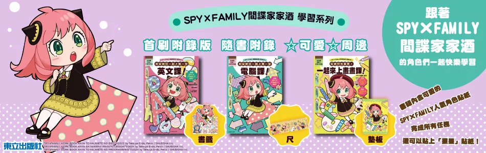 全球熱賣的漫畫作品「SPY×FAMILY間諜家家酒」,這次推出專為小朋友設計的入門學習書系列!「英文課」學習書當中設計了許多有趣的單元活動,帶領小朋友認識英文字母、單字和句型,也有許多寫給家長的小訣竅,幫助小朋友和安妮亞等漫畫角色一起從遊戲中學習,為將來打下良好的基礎!