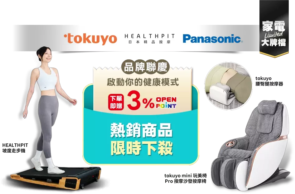 1.於2026/1/17(六)00:00~2026/1/21(三)23:59活動期間內(以實際完成結帳流程之時間為準)購買【tokuyo × HEALTHPIT x Panasonic指定品】,送 OPENPOINT點數 3%(訂單金額以實際消費金額計算)。