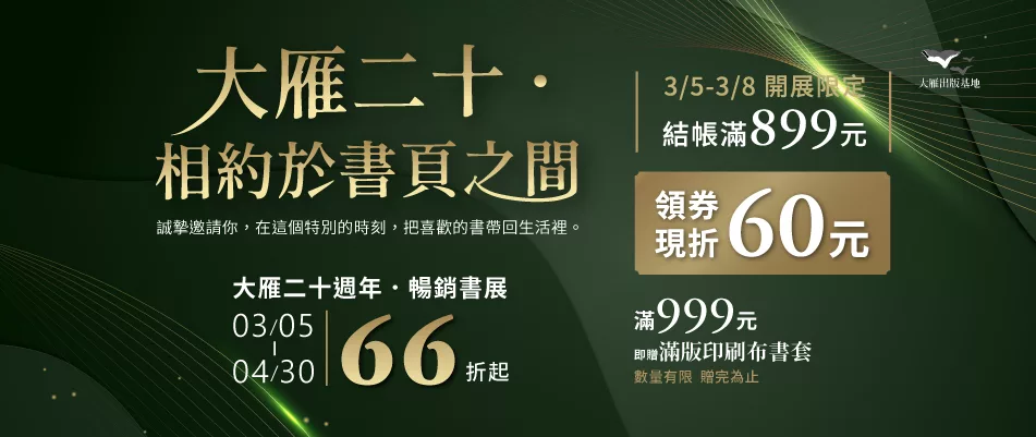 滿999元贈送【大雁20】紀念滿版印刷布書套乙個,數量有限,送完為止。