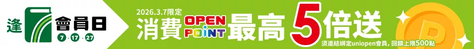 | 7. | OPENPOINT入點時間:於2026/5/31起陸續匯入您的uniopen帳戶。請至「會員專區>會員信件訂閱管理>訂閱OPENPOINT點數生效提醒信」,博客來將於OPENPOINT點數匯入您uniopen會員帳戶後發信提醒您。 |
